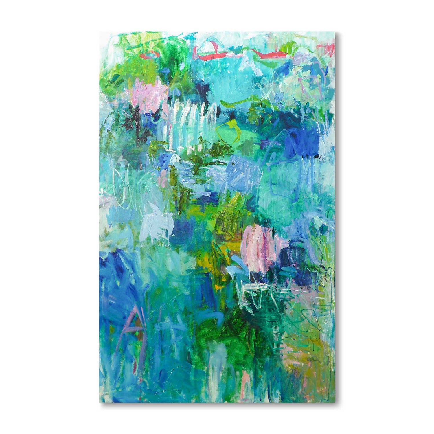With colours of subtle pinks, pale blues and greens, with strong reds and black contrasting in their bold, calligraphic sweeps of the brush, flirting with the abstract expressionist gestures of paint and play with the figurative within the abstract, the eye is continually seduced by her succulent use of colour and beautiful handling of paint.