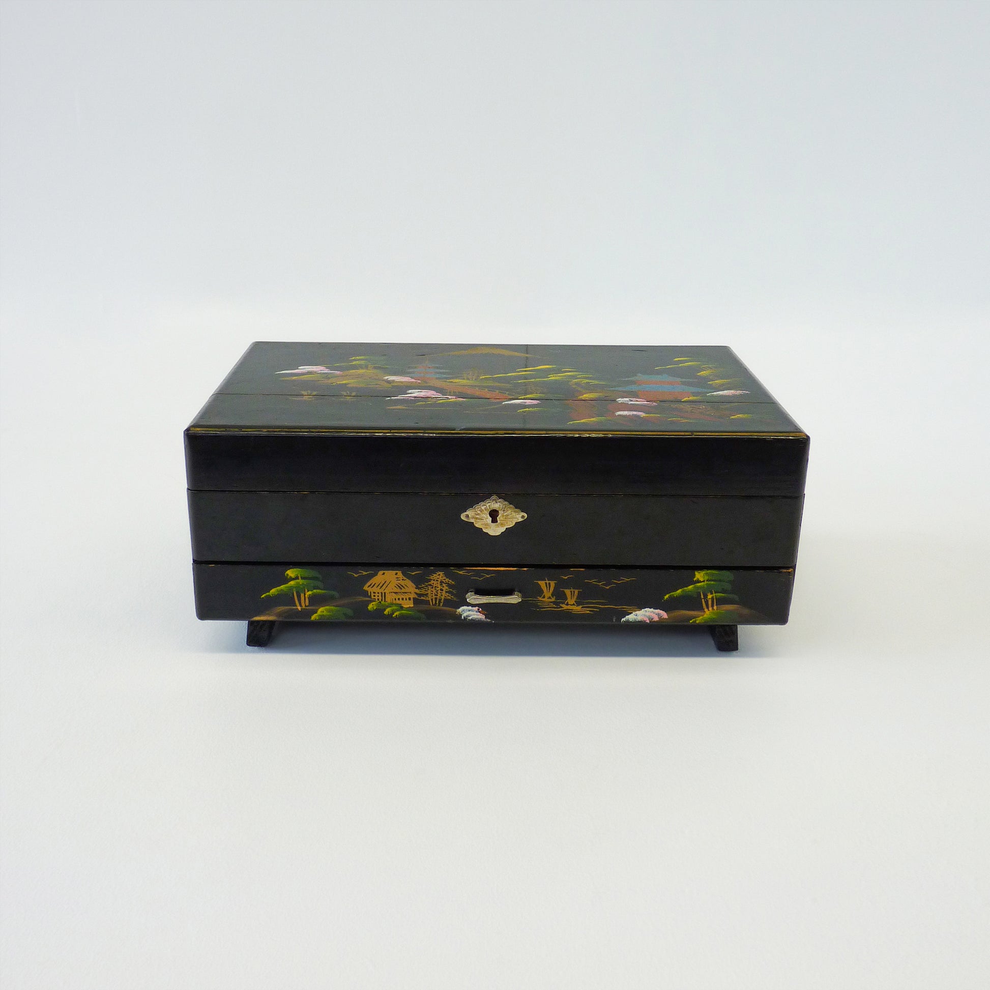 Description: Original 1940's black hand painted Japanese musical jewellery box