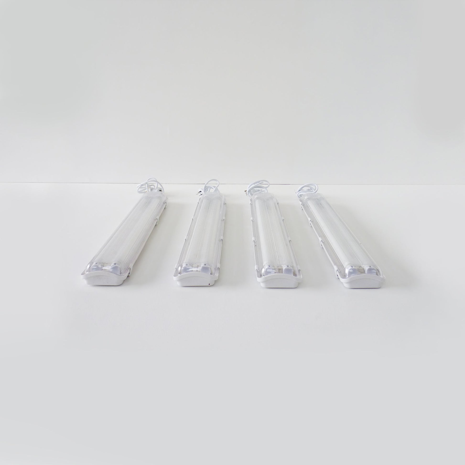 Description: Modern 2-foot double weatherproof fluorescent batten light fittings with thin profile