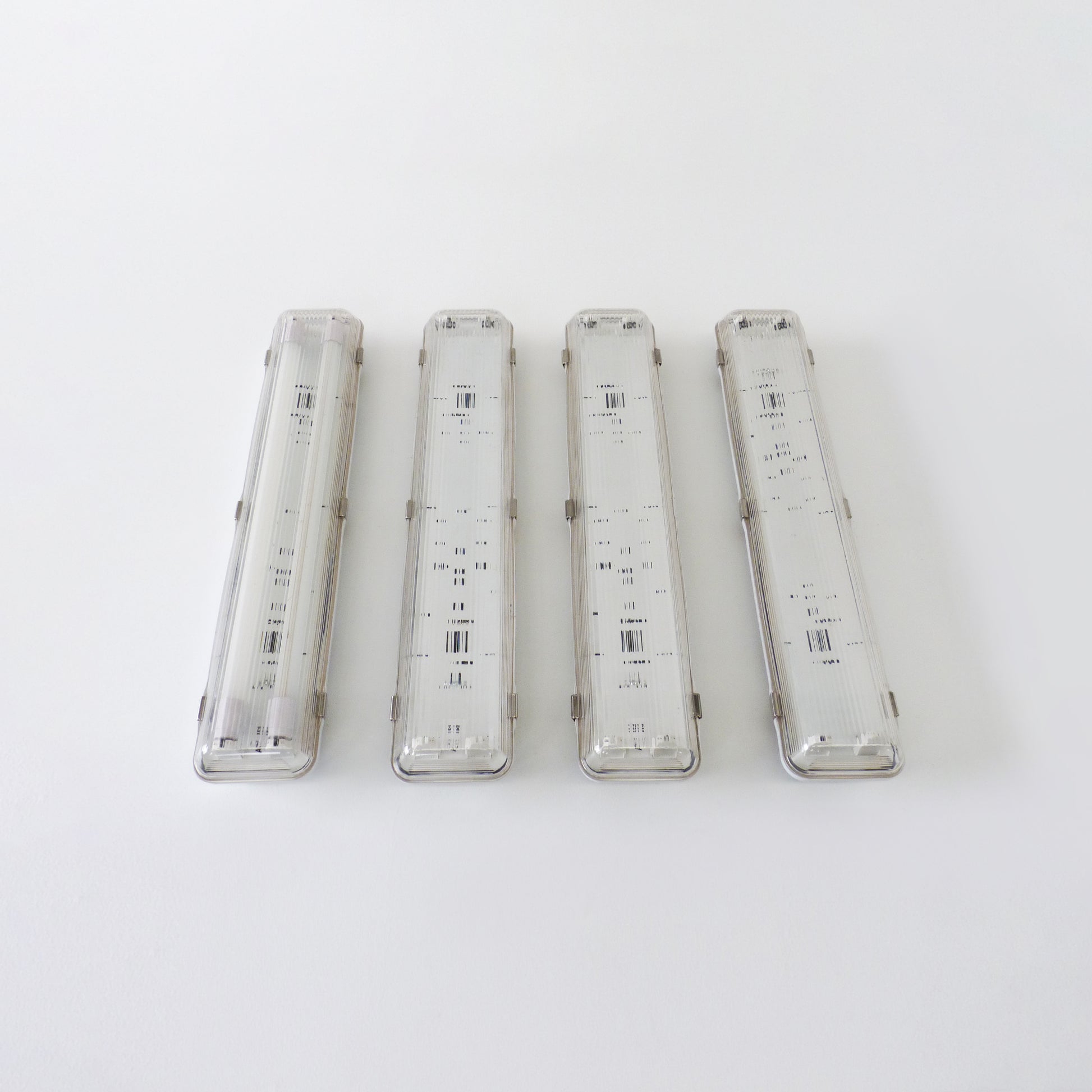 Description: Modern 2-foot double weatherproof fluorescent batten light fittings plus globes