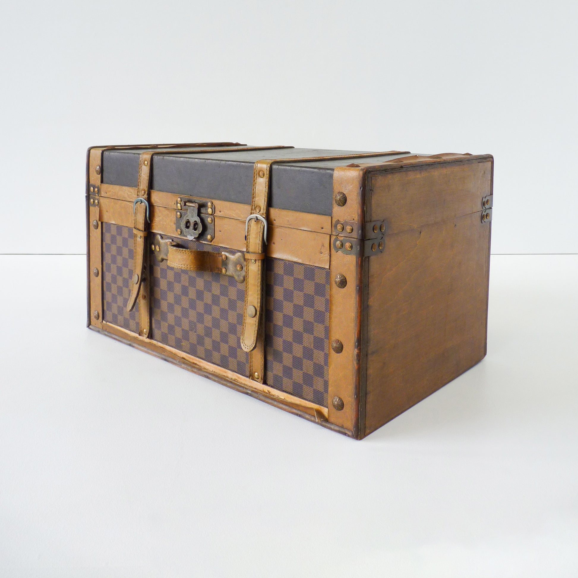 Description: Leather chest with a checkerboard pattern and tan leather straps