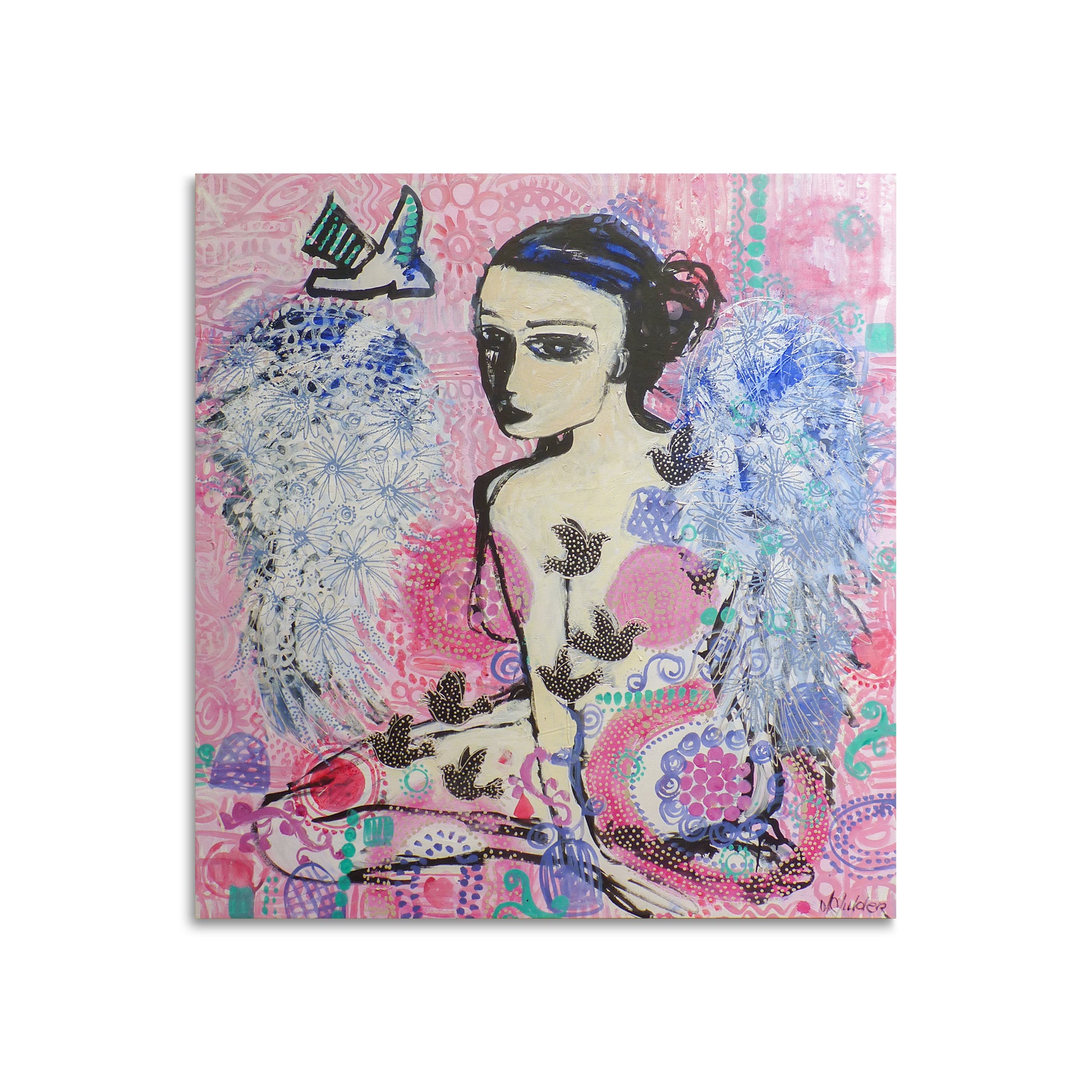 Description: Large female form with flowers and birds. Acrylic and oil on canvas