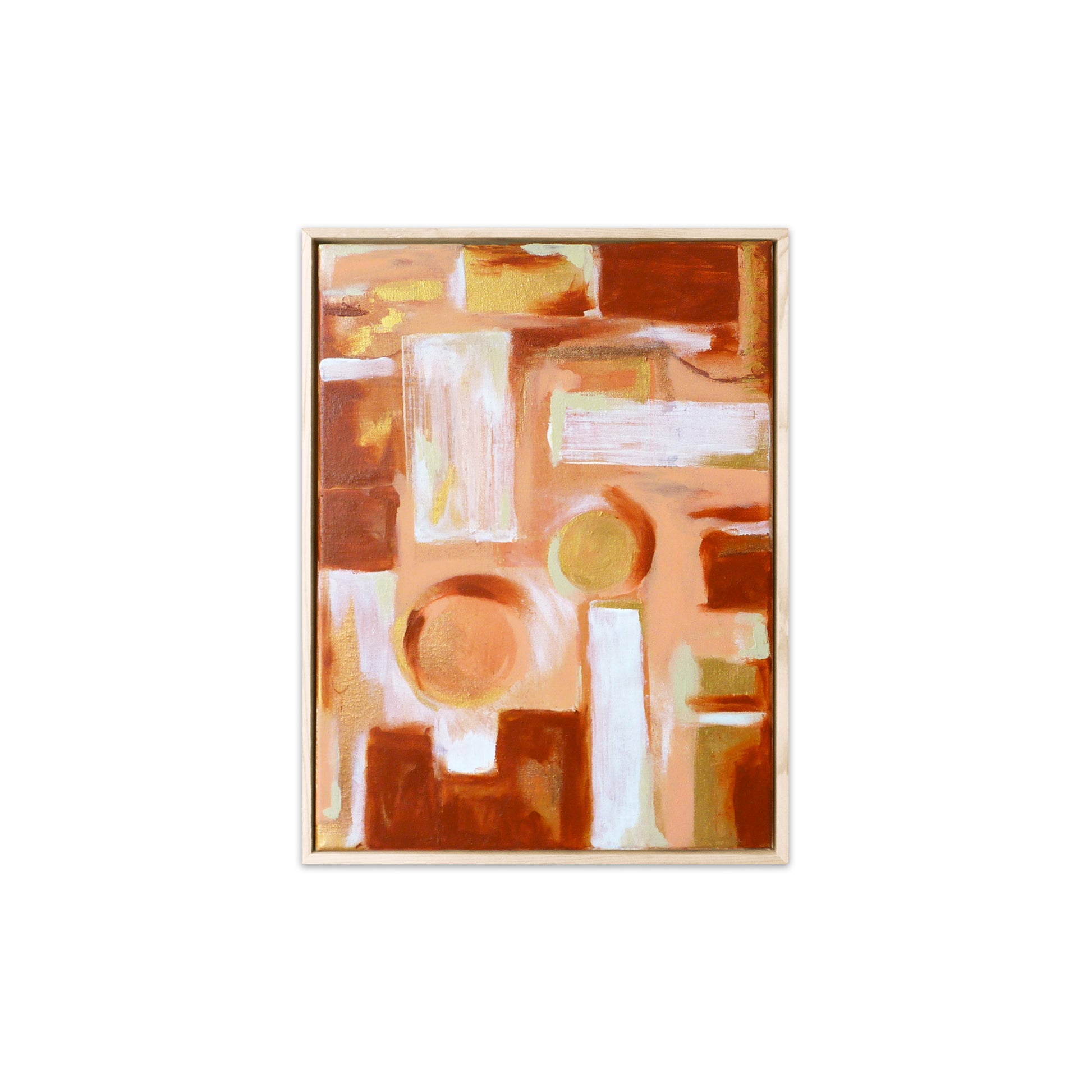 Description: Pink, red and Peach abstract in floating frame. Acrylic and oil on canvas