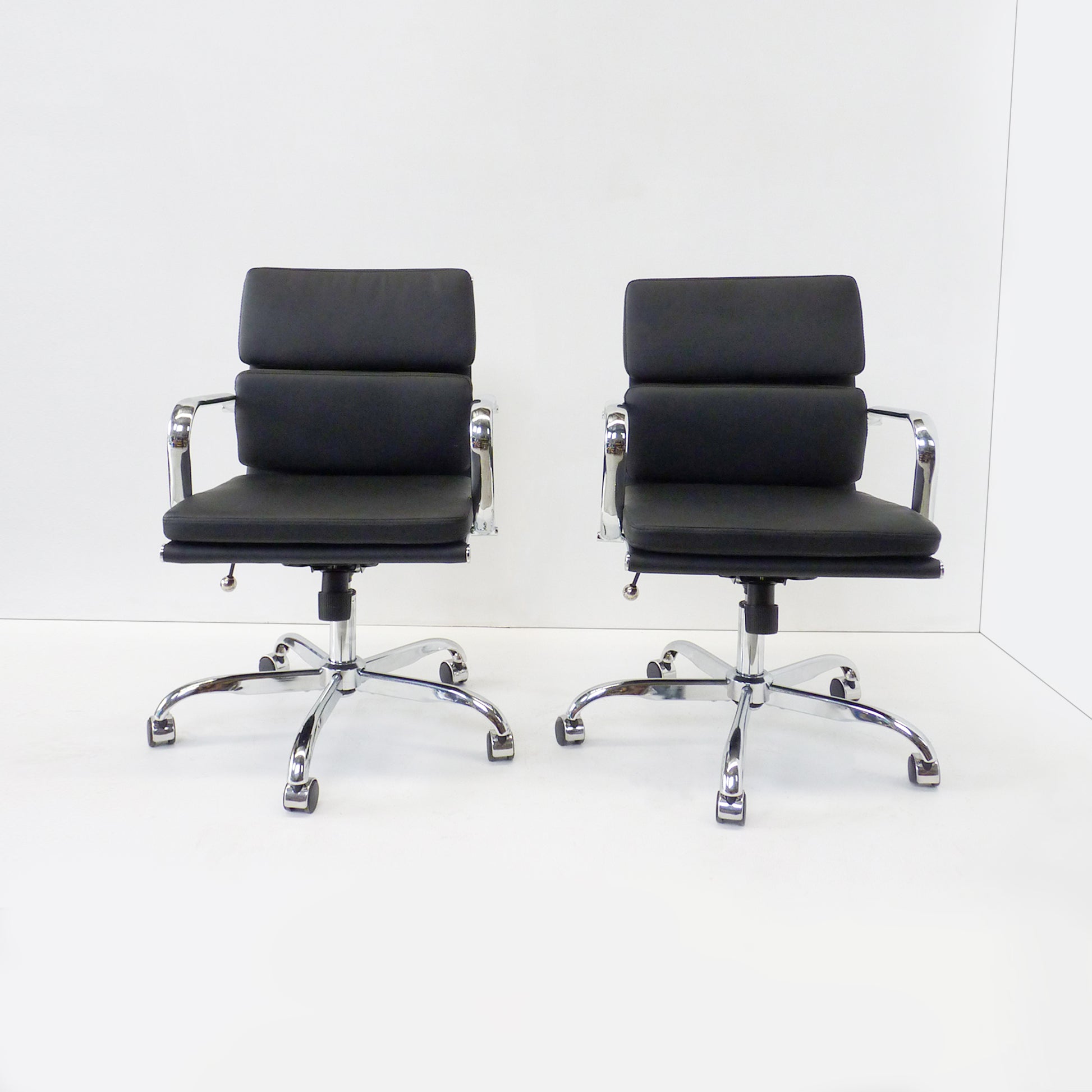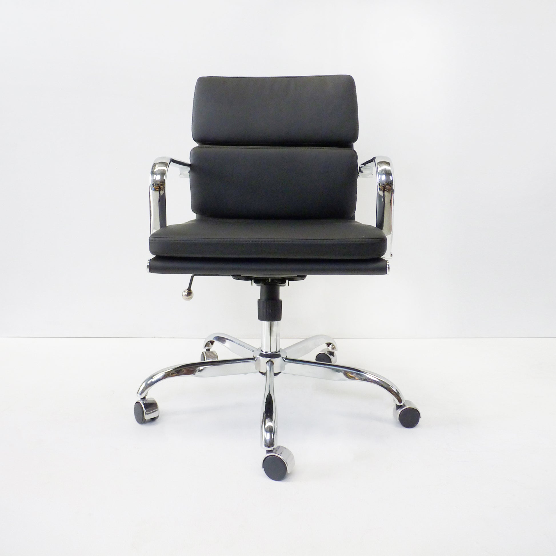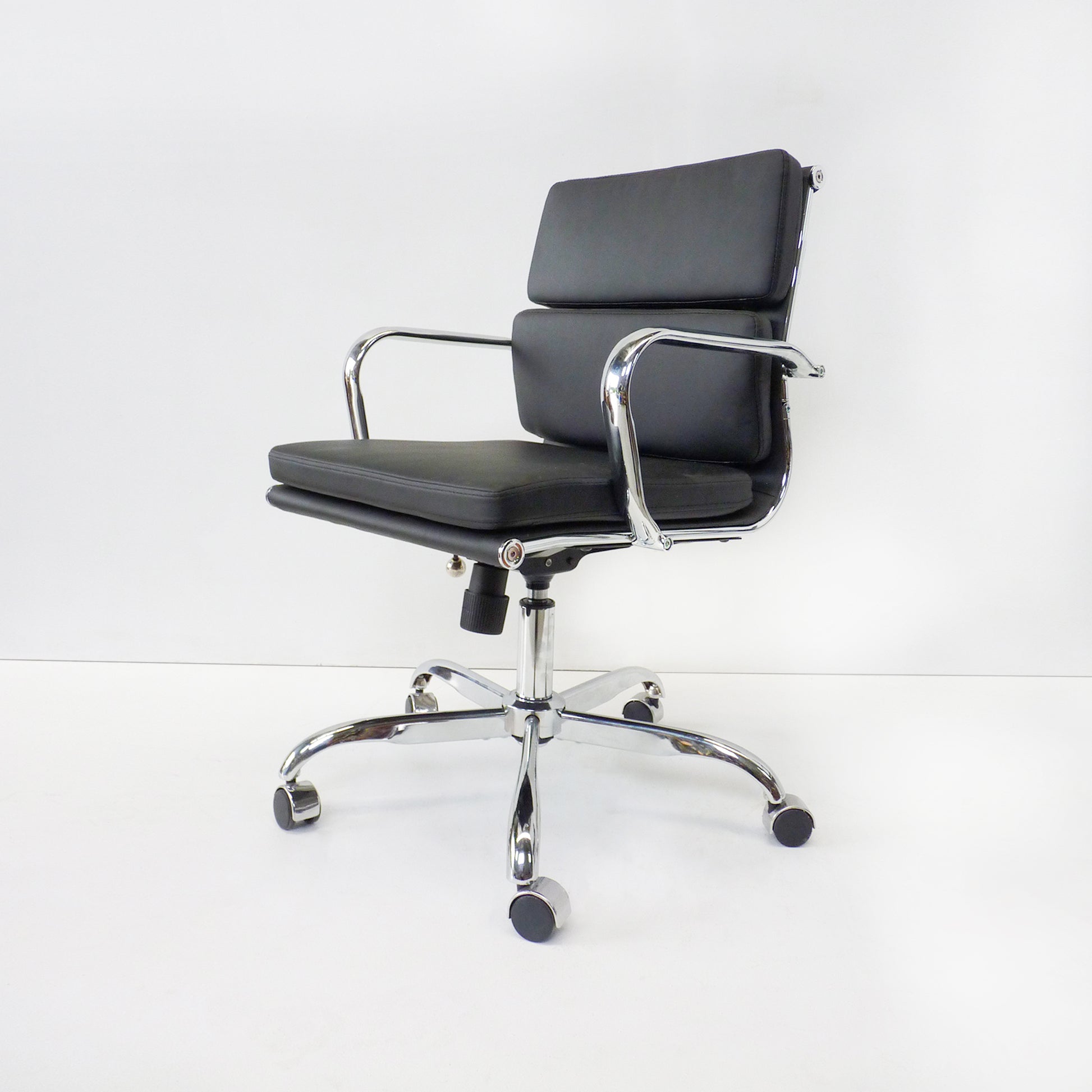 Description: Plush padded Leather office chair, black and chrome with arm rests