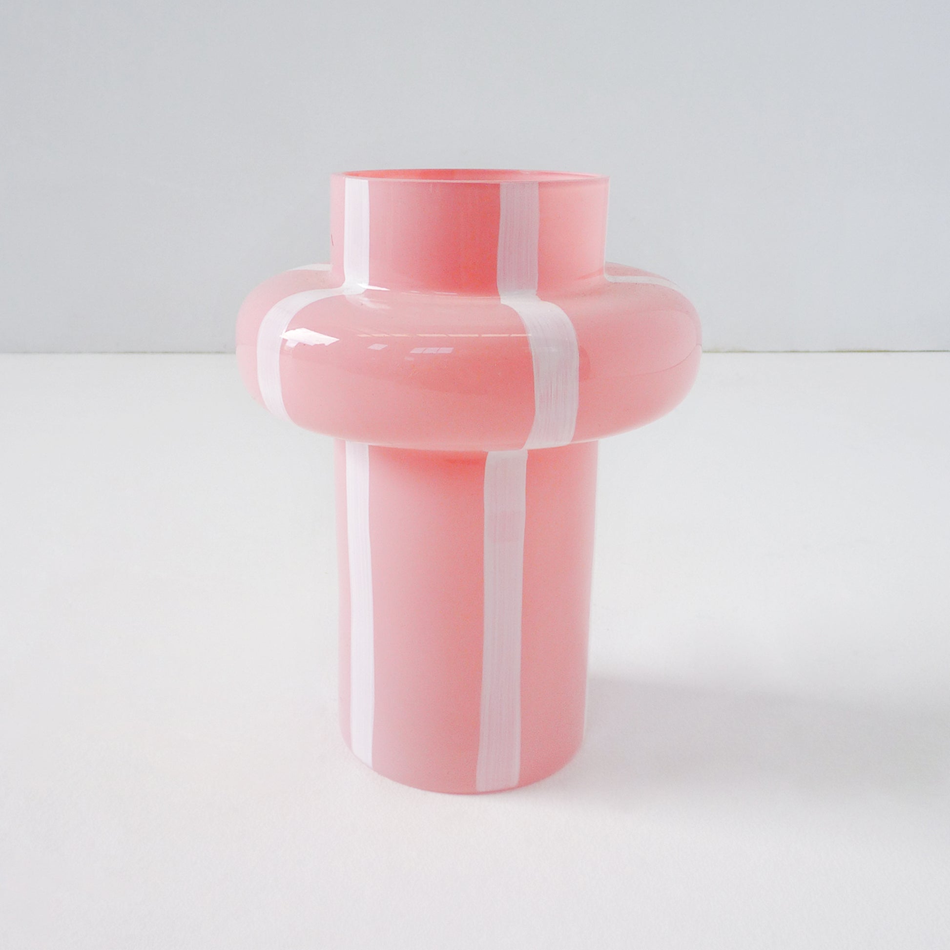 Description: Pink bulbous cylindrical vase with painted white stripes