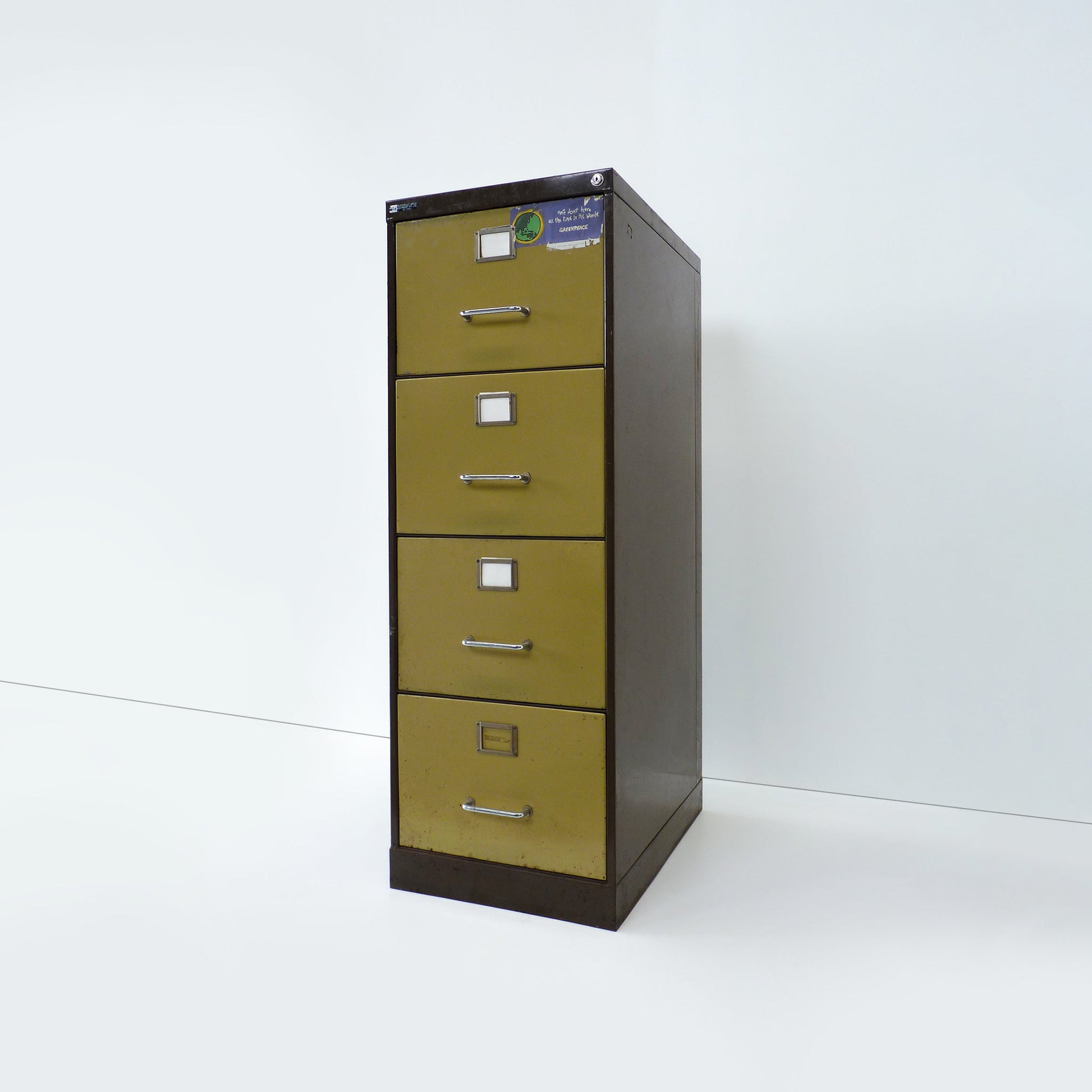 Description: 1980’s olive green and brown filing cabinet