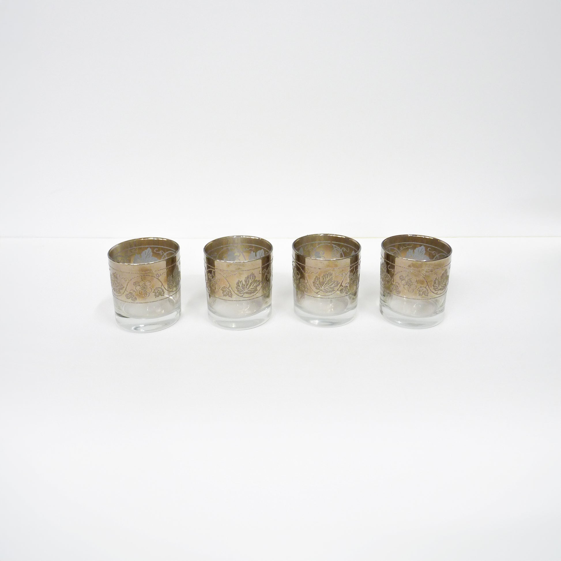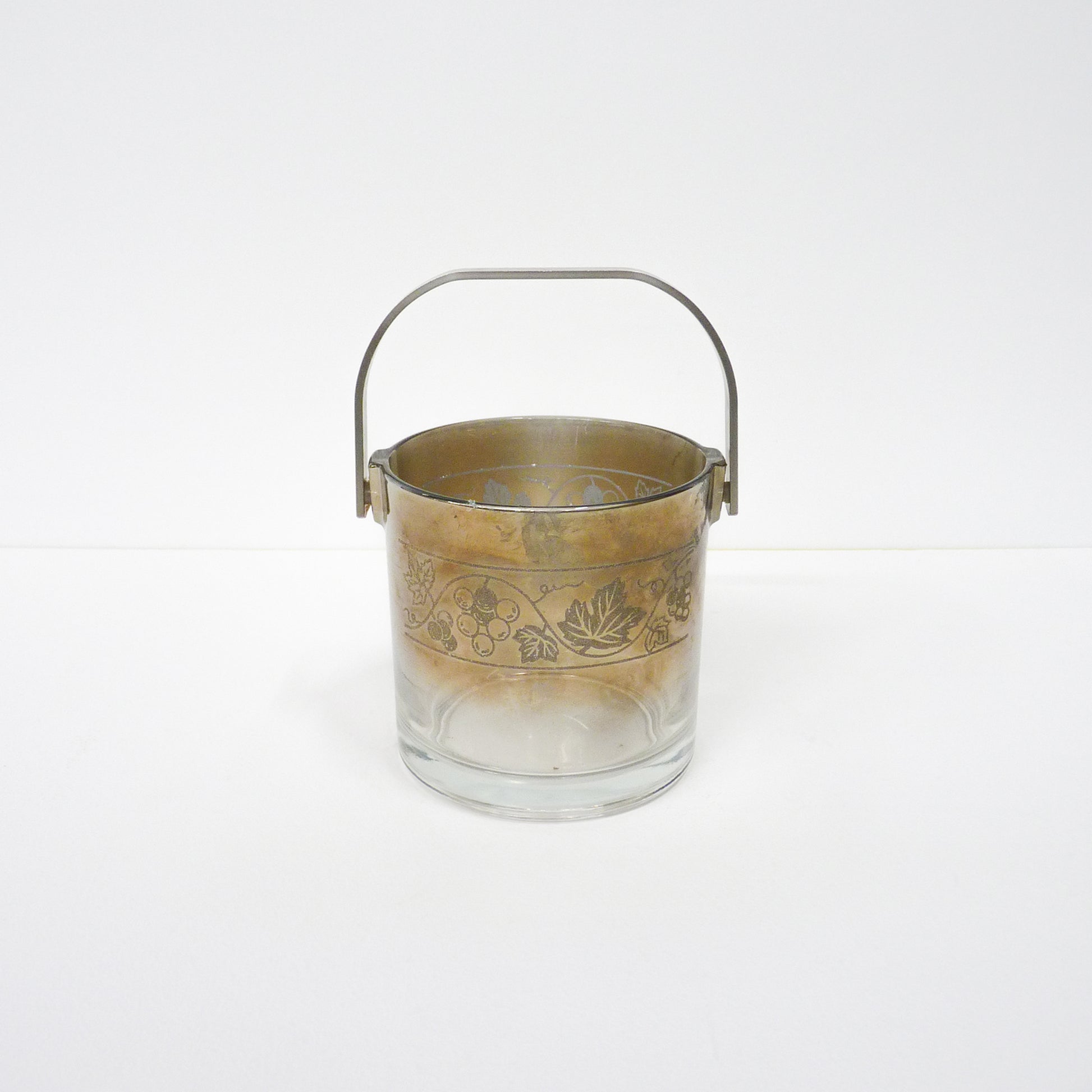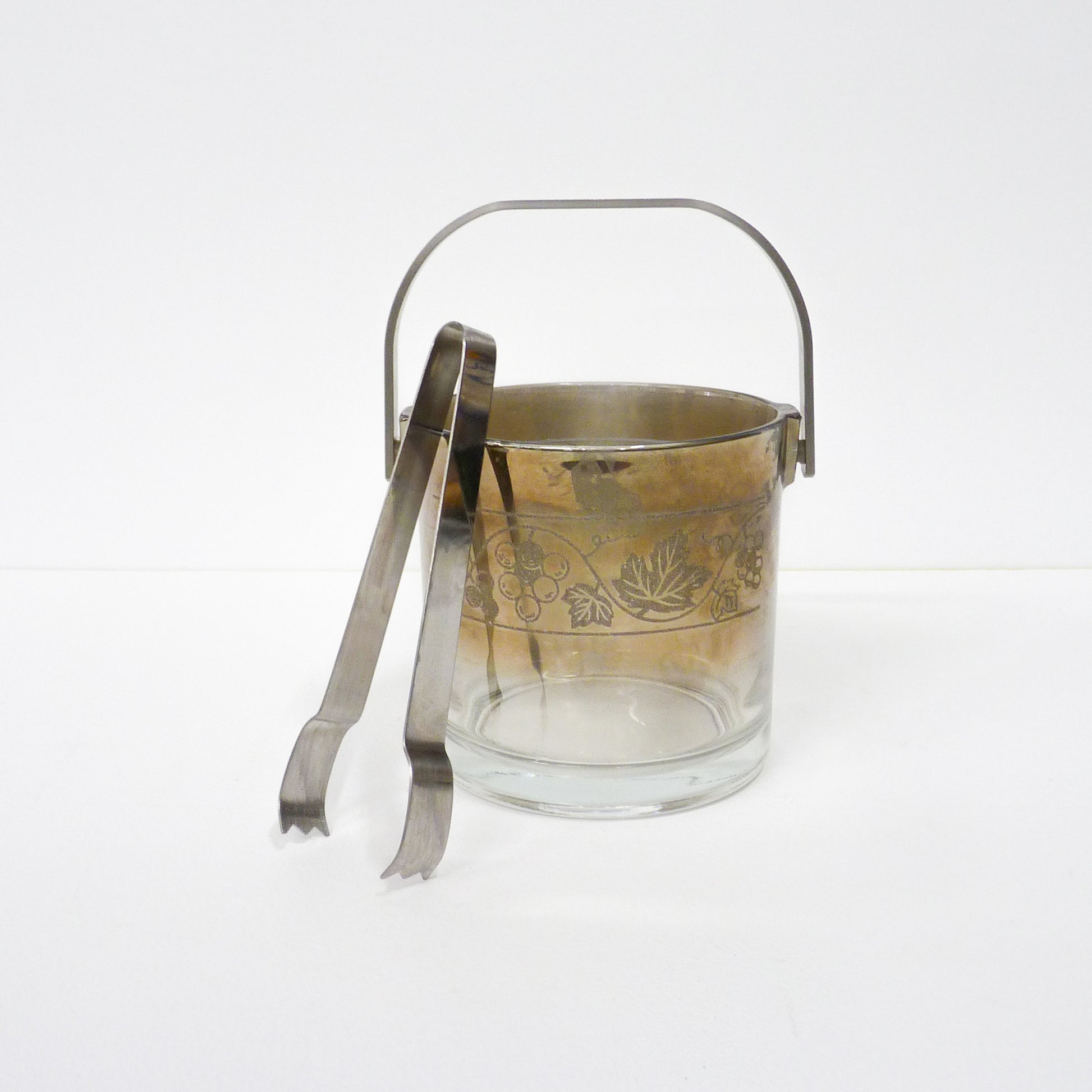 Description: Vintage 6 piece smokey glass with silver detail, tumbler and ice bucket set