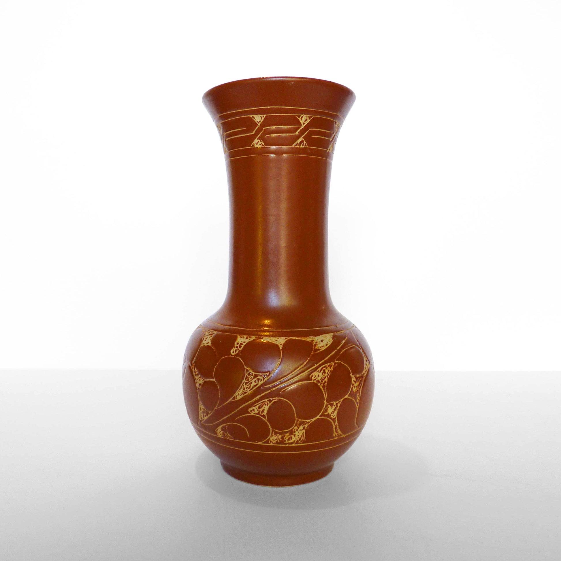 Description: Vintage brown ceramic vase with light floral detail