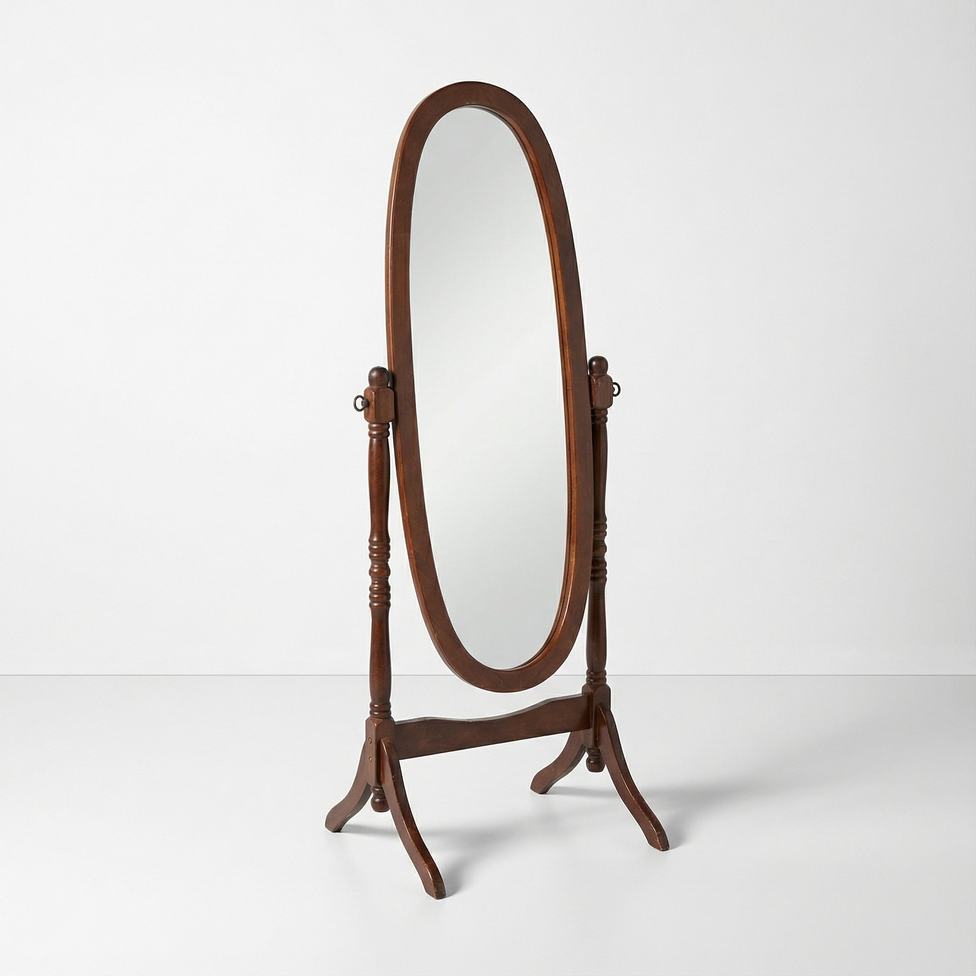 Description: A classic oval cheval mirror in a dark timber frame. This full-length, freestanding mirror features turned wood posts.